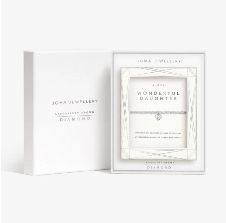 Say hello to our latest collection, Laboratory Grown Diamonds. Combining sparkle and style, with the same look and feel as natural diamonds, our Laboratory Grown Diamond A Little 'Wonderful Daughter' Bracelet In Silver Plating is threaded with shining silver-plated beads, crowned with a heart-shaped charm, set with a Laboratory Grown Diamond, and nestled in a beautiful tiered gift box. This special collection promises elevated gifting for every occasion!