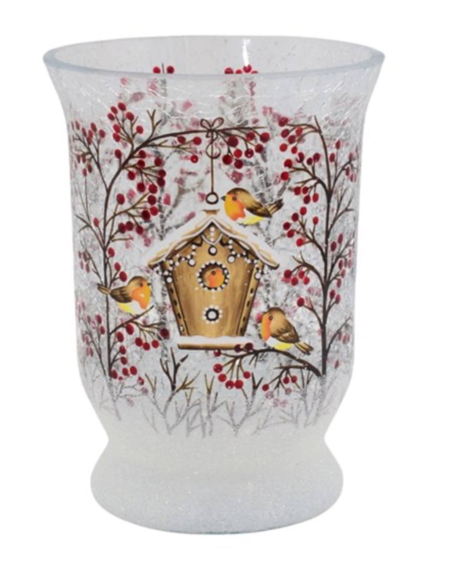 Add a cozy, festive touch with this 15cm Robin Hurricane. Featuring a charming robin perched by a birdhouse on a snowy crackle glass base, it brings warmth and cheer to any room. Its delicate design makes it a delightful holiday accent that brightens your home with playful seasonal spirit.