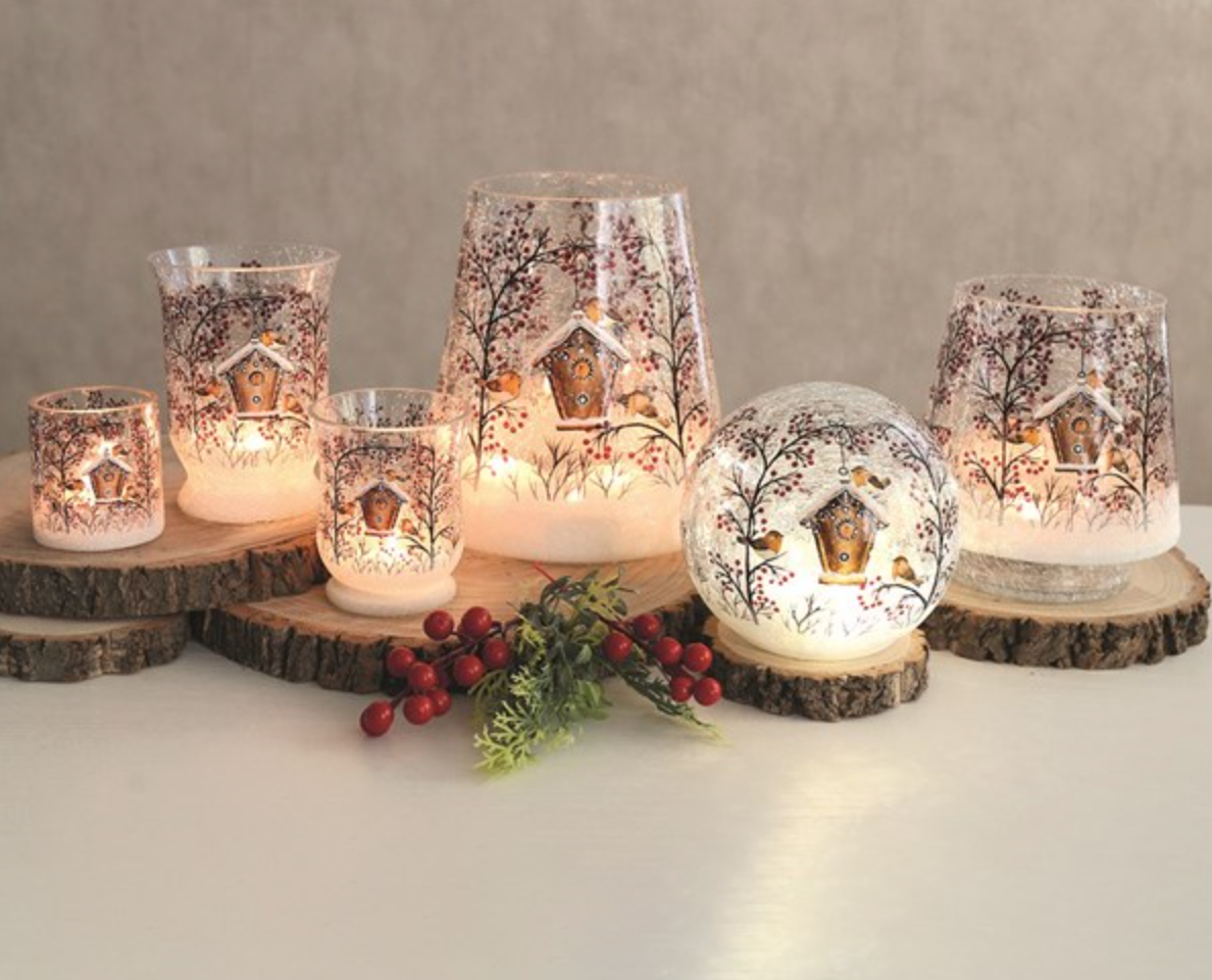 Add a cozy glow to your space with our Robin LED Ball. Measuring 14cm, this charming decoration showcases a detailed robin perched near a birdhouse atop a snowy white base. Its crackle glass finish adds a magical sparkle when illuminated. Battery-operated for easy placement anywhere—just insert 3 AA batteries (not included) and watch your home light up with festive cheer.